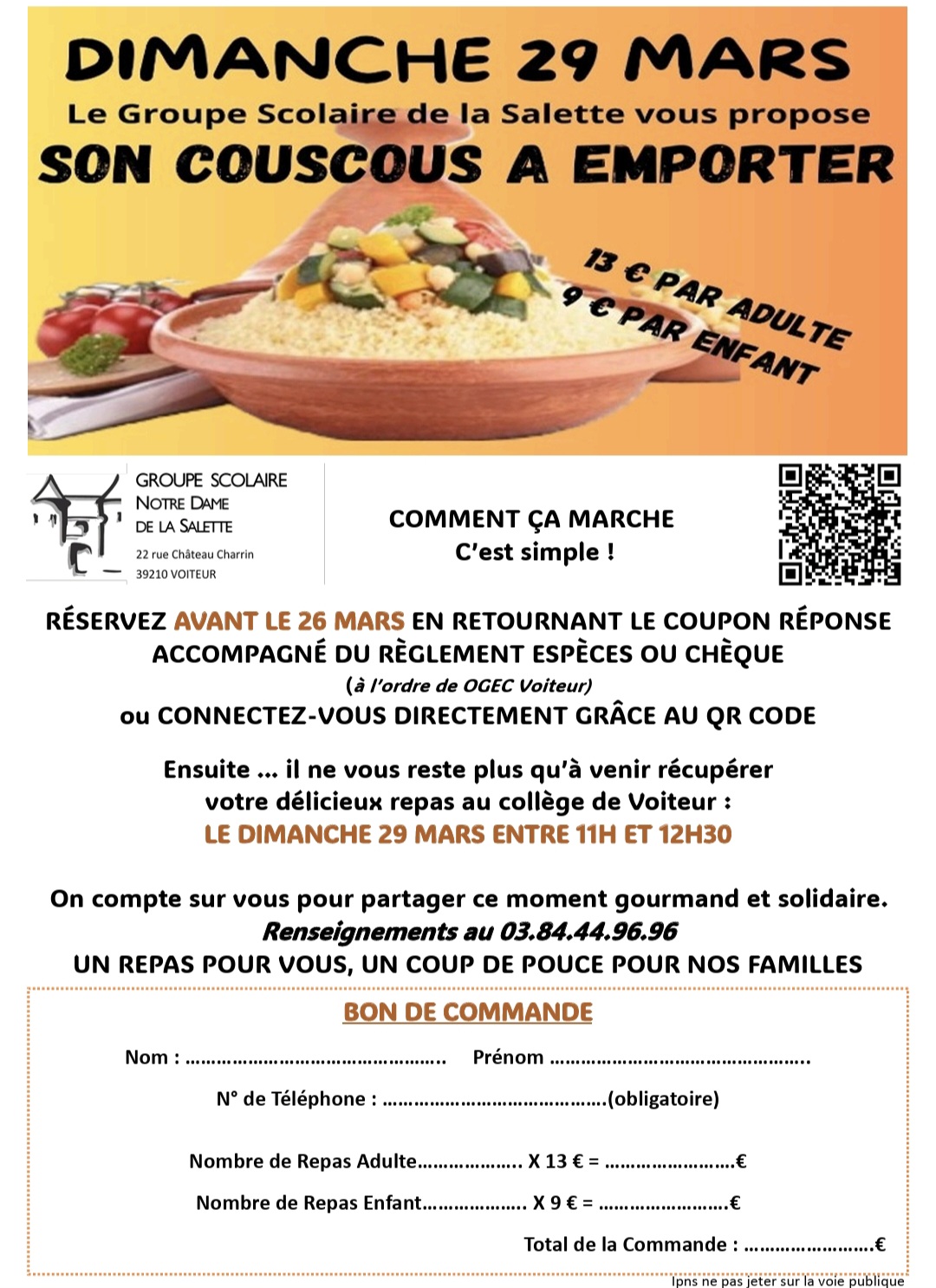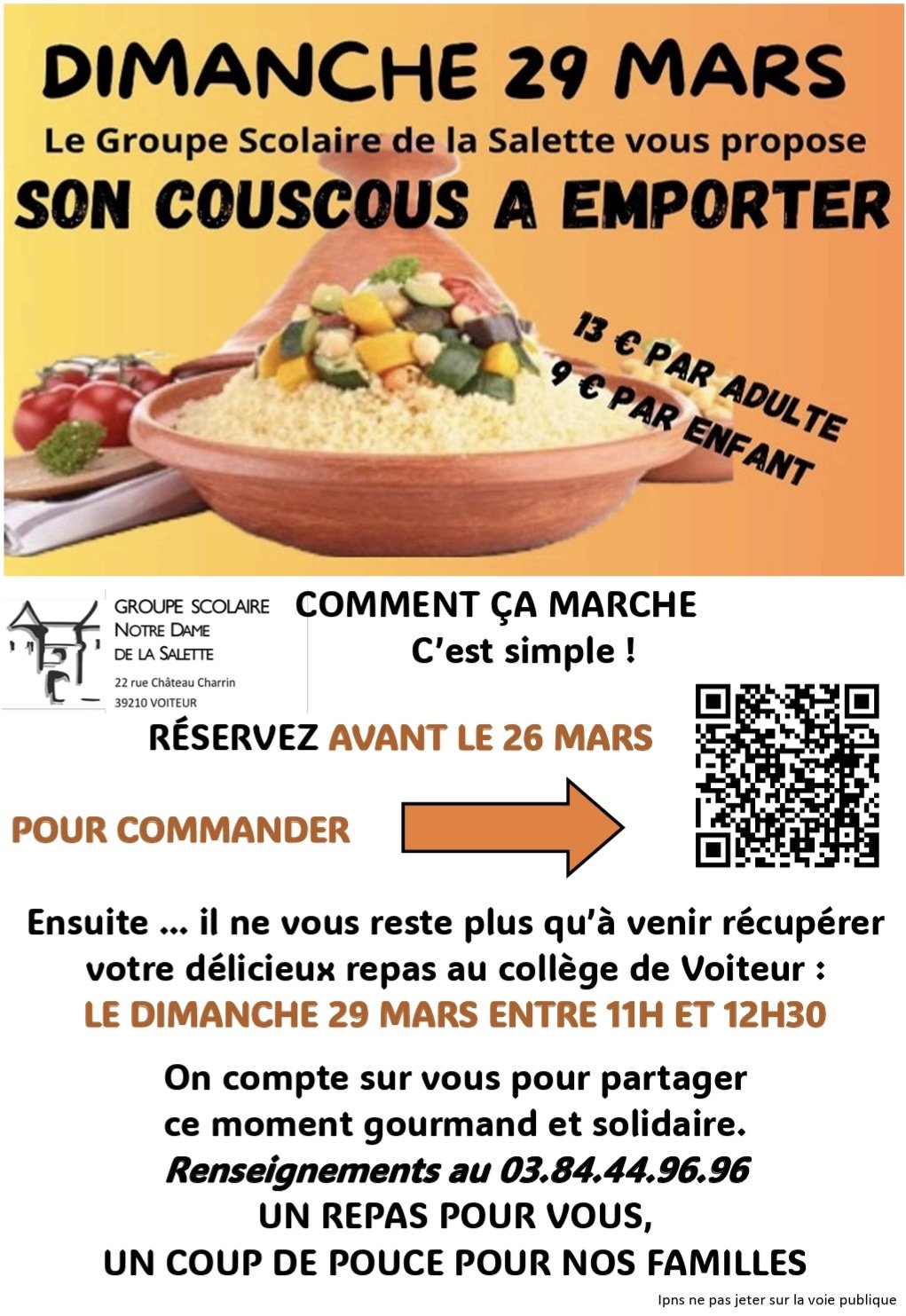 Participez à notre action solidaire : le groupe scolaire de la Salette organise une vente de couscous à emporter au profit des familles. Commandez et venez retirer votre repas le 29 mars au collège.