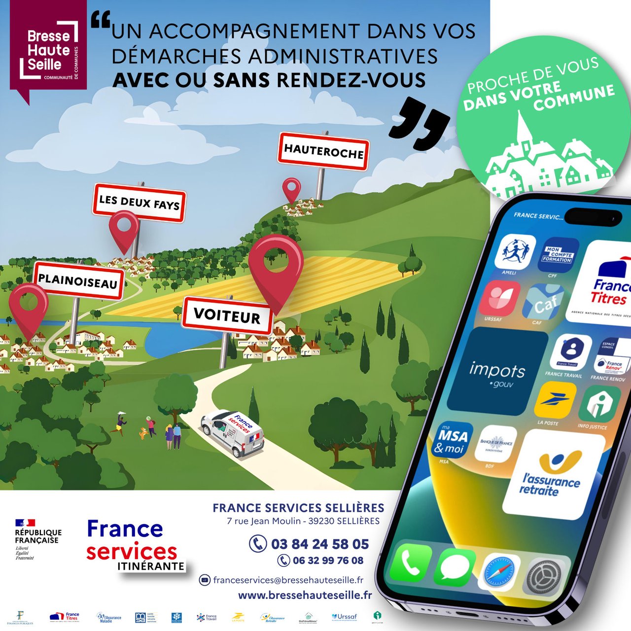 Partout sur le territoire de la Communauté de Communes, vous avez accès à différents services des douze partenaires Nationaux : Caisse d'Allocations Familiales, France Titres, Assurance retraite, Assurance Maladie, Chèque énergie, Finances publiques, France Travail, France Rénov', La Poste, MSA, point-info-justice, et plus récemment l’URSSAF.